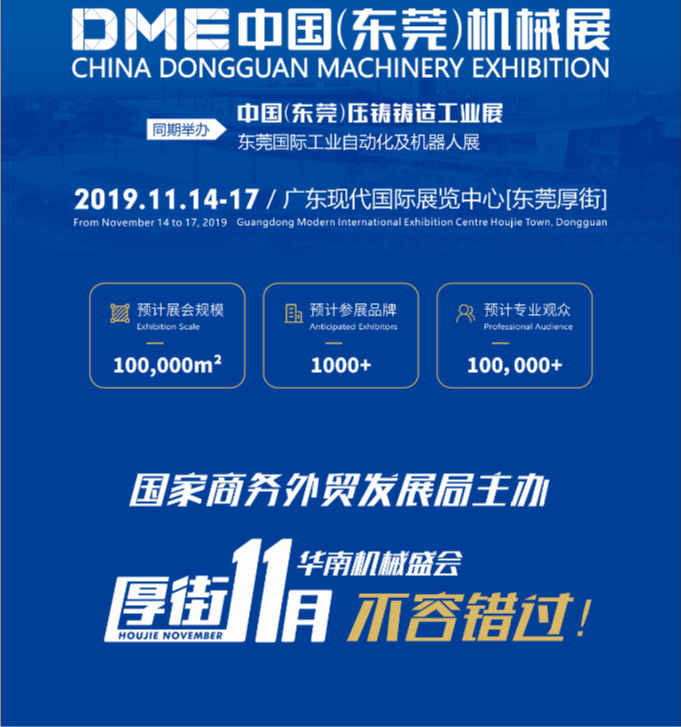 在當前“中國制造”邁向“中國智造”的關鍵時期,展覽業(yè)也在不斷助力智造升級。2019全新 DME中國東莞機械展將于11月14-17日在東莞厚街·廣東現(xiàn)代國際展覽中心舉辦。